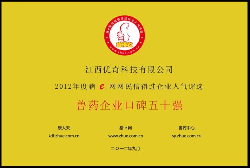近日,由中國豬e網(wǎng)舉辦的“中國信得過獸藥企業(yè)人氣評選活動”順利落幕,在網(wǎng)友投票下,江西優(yōu)奇(動保)科技有限公司票數(shù)位列前茅,經(jīng)投票最后優(yōu)奇(動保)科技榮獲“2012年度信得過獸藥企業(yè)50強”。