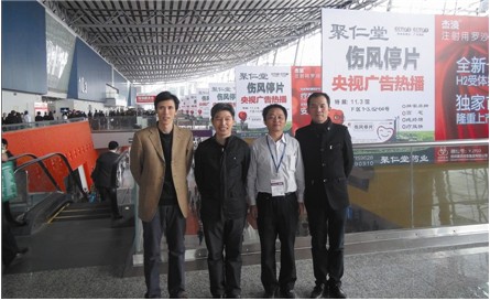 聚仁堂藥業(yè)領(lǐng)導(dǎo)團隊在第68屆全國藥交會現(xiàn)場傷風(fēng)停片大幅廣告前合影